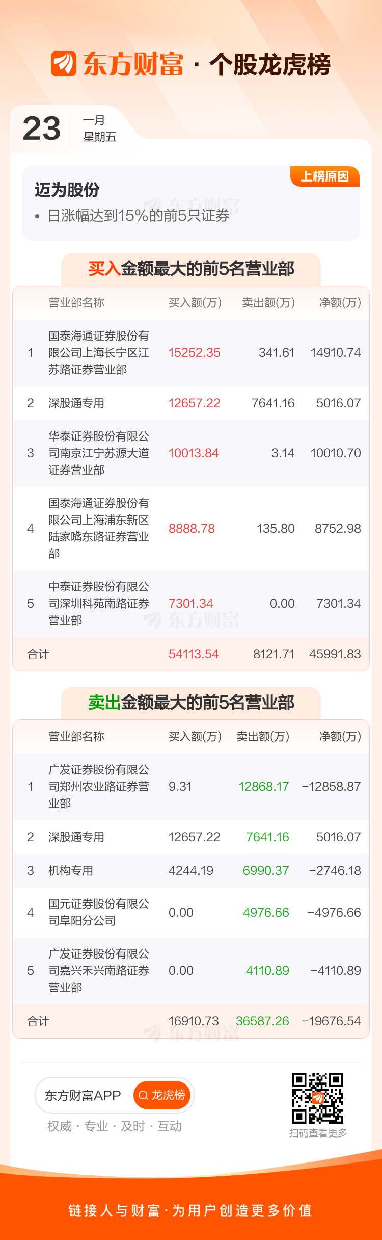 交易所2026年1月23日公布的交易公开信息显示,迈为股份因成为日涨幅达到15%的前5只证券上榜。迈为股份当日收报324.36元,涨跌幅20.00%,偏离值20.00%,换手率4.26%,成交额26.02亿。