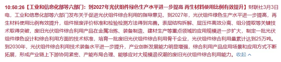 3月3日财联社消息,工业和信息化部等六部门联手发文,专门针对光伏组件的综合利用,