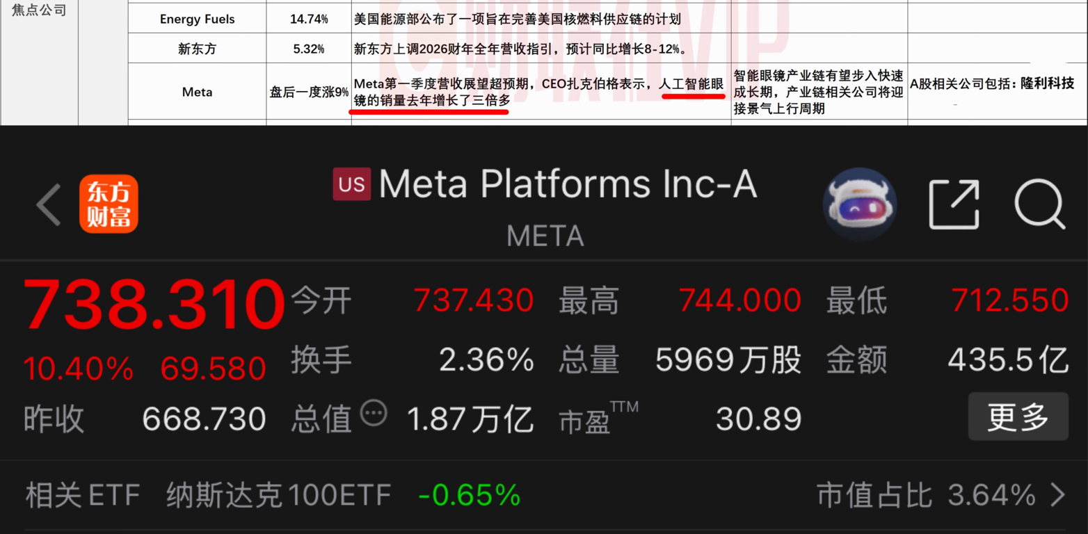 Meta扎克伯格表示人工智能眼镜的销量去年增长了三倍多,昨晚收盘逆市上涨了10.40%市值达1.87万亿美元!$隆利科技(SZ300752)$
