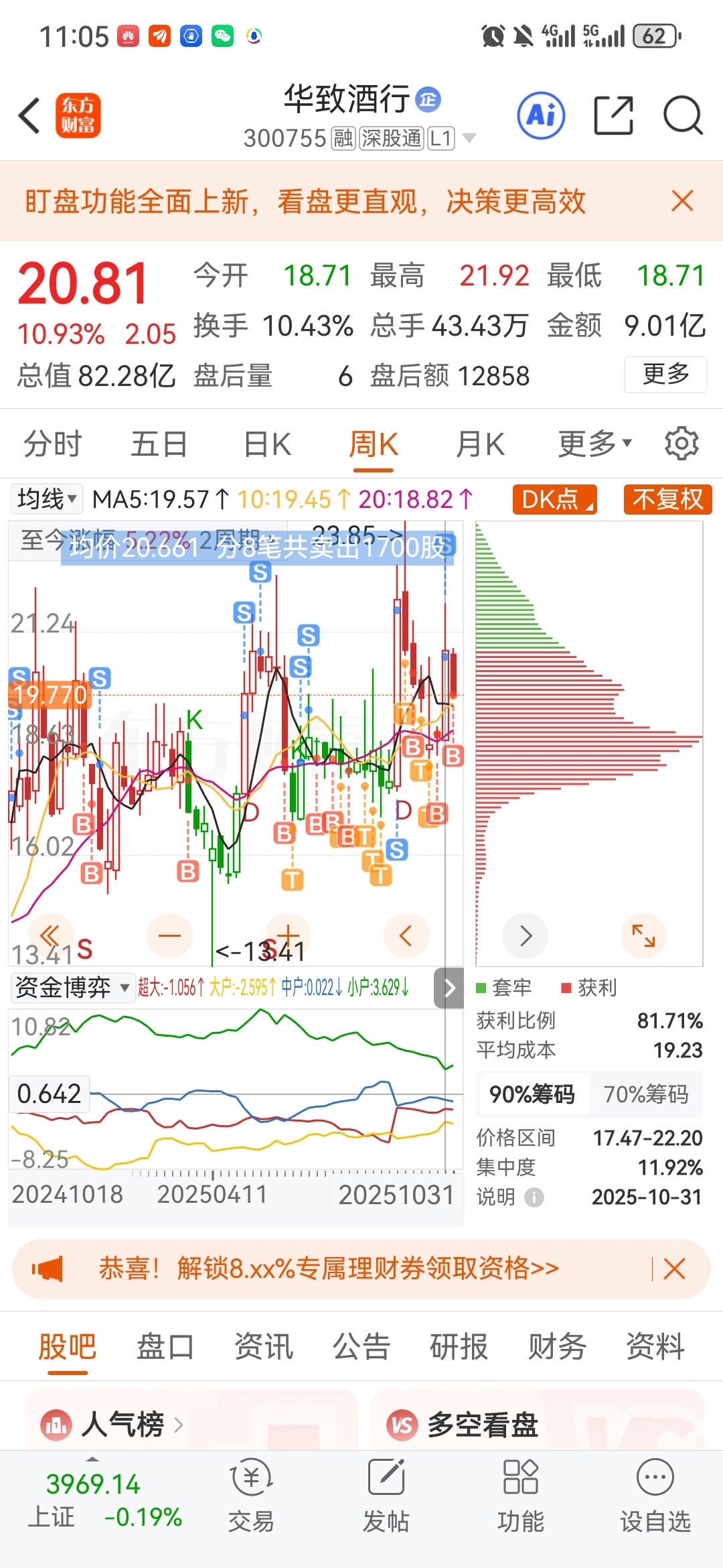 $华致酒行(SZ300755)$ 锚定一支股票反复做T低于20加仓,超过21减一减