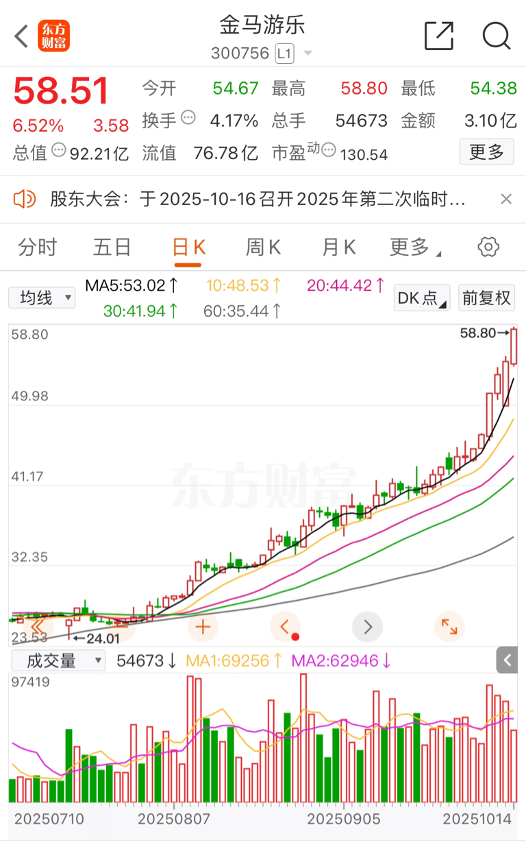 $金马游乐(SZ300756)$ 金马游乐 加速上涨,涨疯了