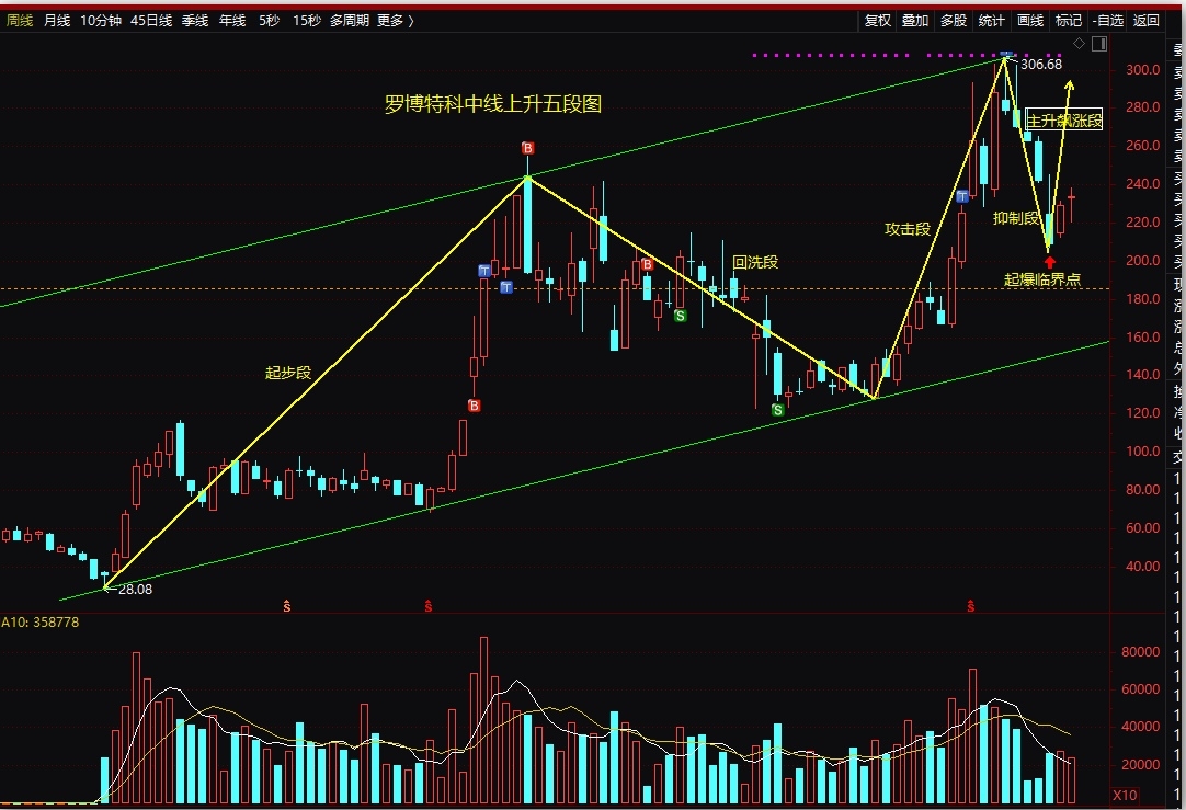 好久没提萝卜了,大家都还好吧。本周两根假阴线调整即将突破第二箱体的中轴线271元进入强势区间,第一波攻势中给了307元的目标价,这一波会到哪里呢,突破前高306.68元后再聊。先上图,日线可期待第二箱体突破,周线期待主升飙涨。