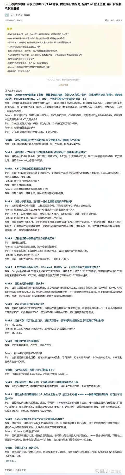 只谈产业进度,1.6T设备的订单还早着呢,1.6T的量还没定下来,预计谷和达子26年2000万只。