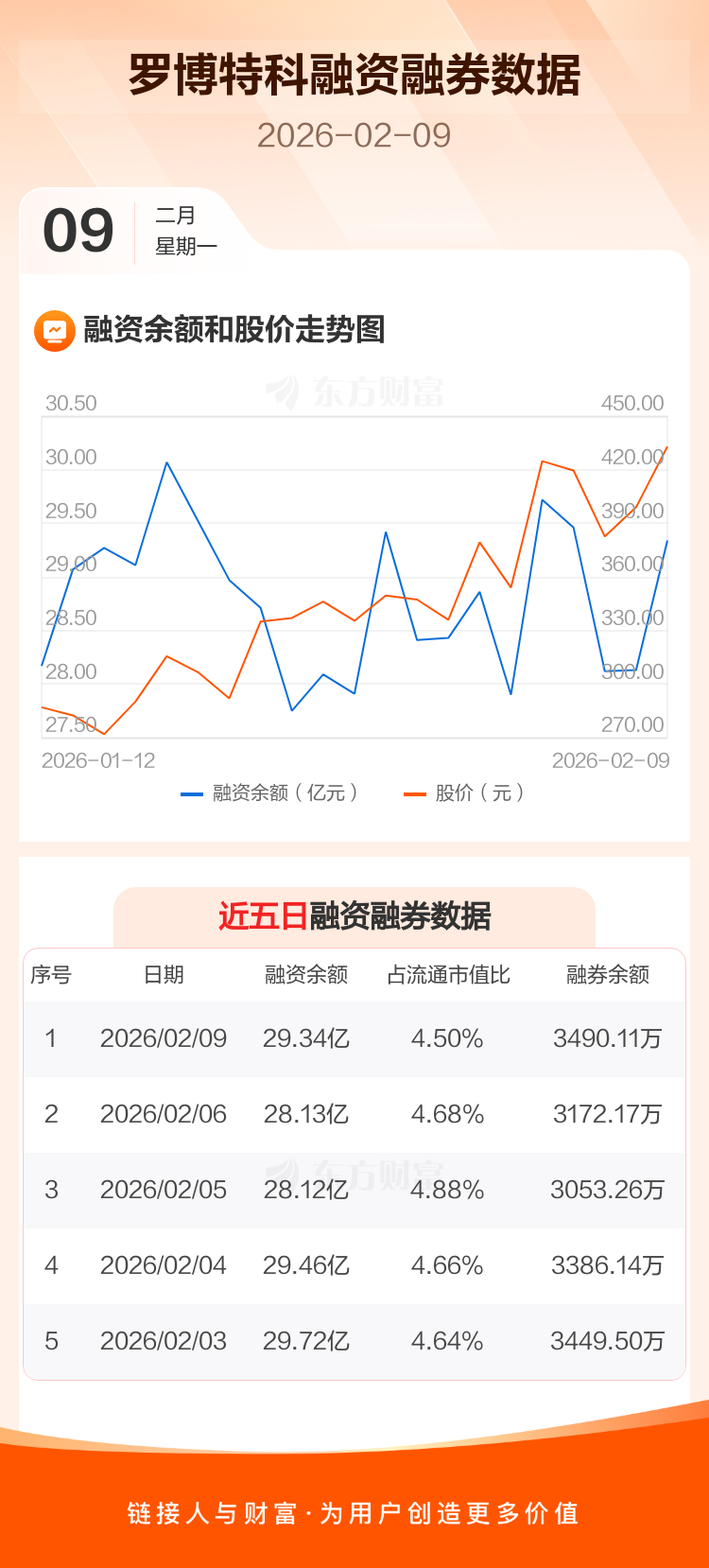 交易所最新数据显示,罗博特科于2026年2月9日获融资买入5.96亿元,融资偿还4.75亿元,当日融资净买入1.21亿元。目前,该股融资余额29.34亿,占流通市值比例为4.50%。