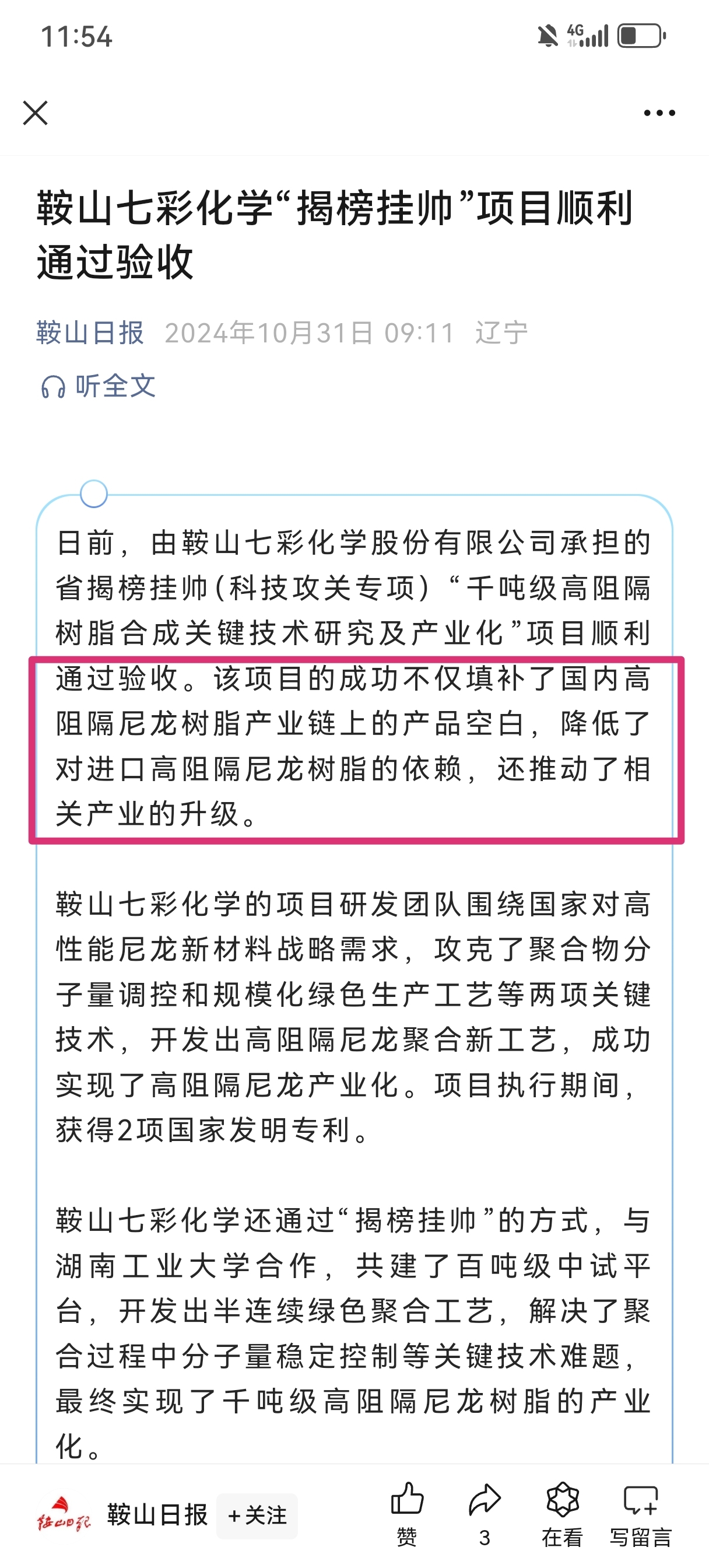 $七彩化学(SZ300758)$ 日前,由鞍山七彩化学股份有限公司承担的省揭榜挂帅(科技攻关专项)“千吨级高阻隔树脂合成关键技术研究及产业化”项目顺利通过验收。该项目的成功不仅填补了国内高阻隔尼龙树脂产业链上的产品空白,降低了对进口高阻隔尼龙树脂的依赖,还推动了相关产业的升级。