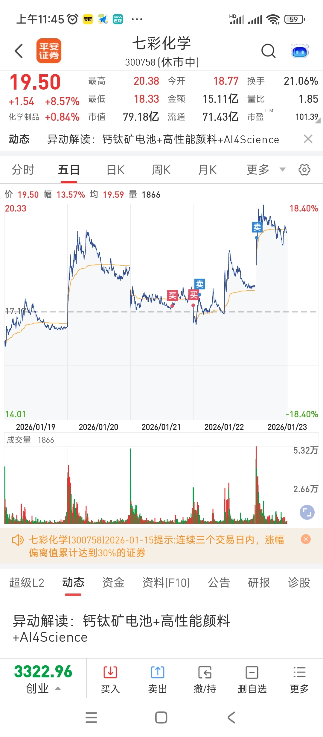 $七彩化学(SZ300758)$ 我走了,可以涨停了