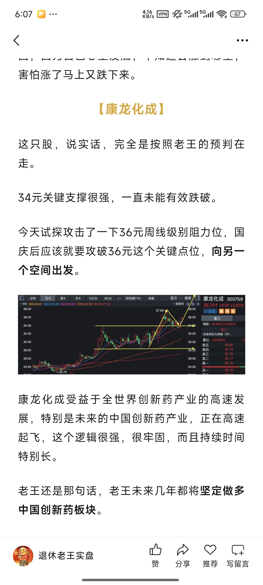 国庆后,就会强攻36元周线级别阻力位,突破后,就向另一个空间出发。老王坚定看多并