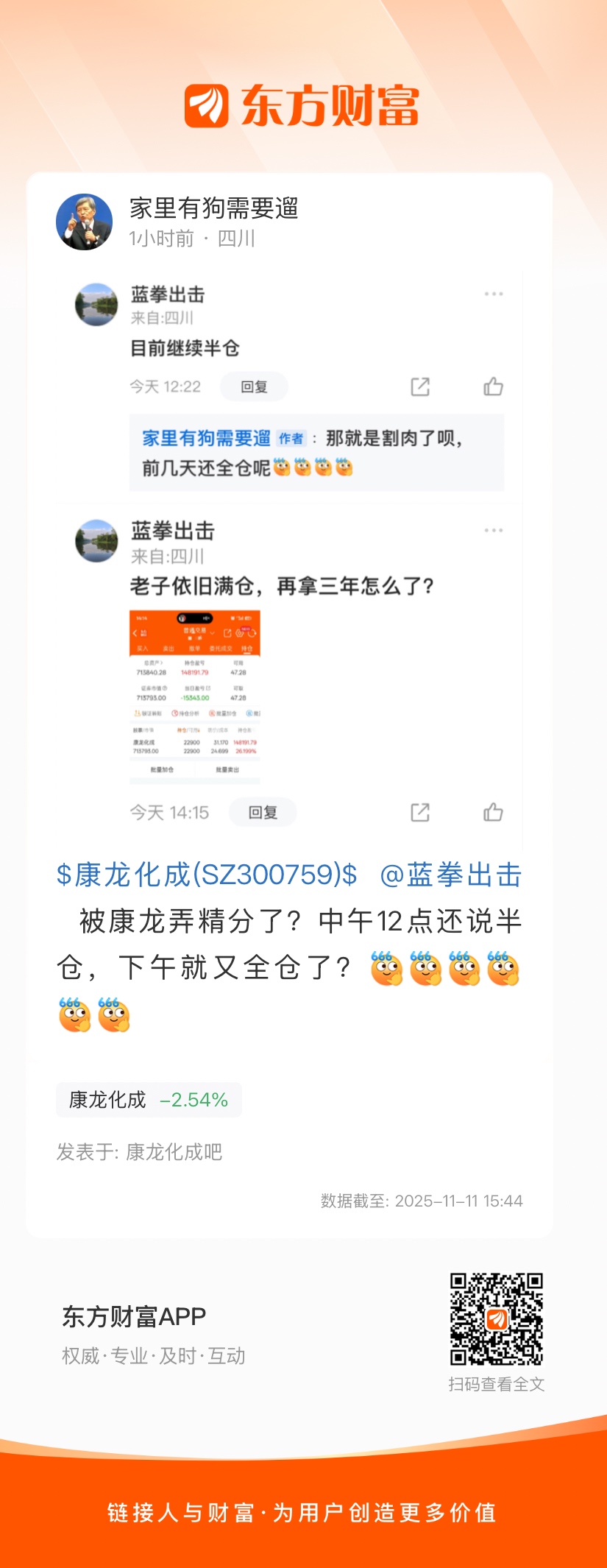 $康龙化成(SZ300759)$  @蓝拳出击   被康龙弄精分了?中午12点还说半仓,下午就又全仓了?