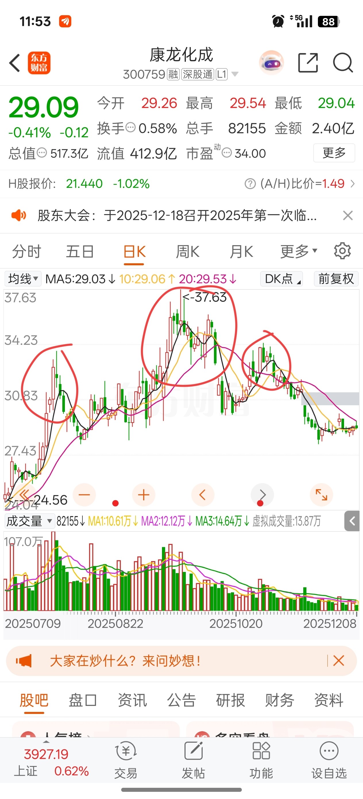 $康龙化成(SZ300759)$ 还是那句话一波止跌的本质一定是散户必须割肉,强调一遍是必须。没有割肉之前就算反弹了后面都还会跌下去,反弹都是为了再次减仓只会跌更久更深,所以这里我更希望直接杀下去。红圈买进的那些人经过这段时间的下跌他们不仅没有割肉反而还在补仓,你们也不要低估了其他跟你一样的散户,悄悄问问你自己为什么没走,你的对手跟你想法也都差不多。耐心等待