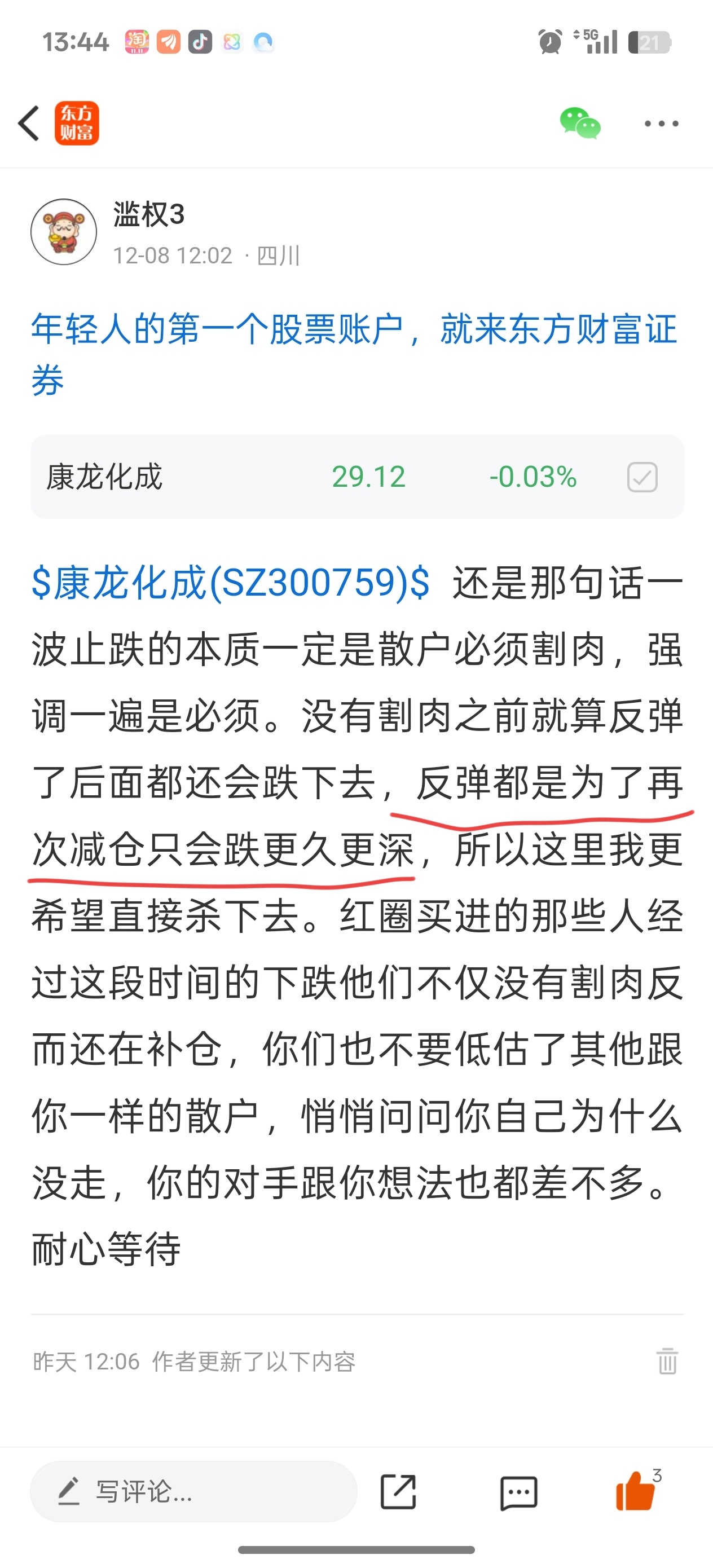 $康龙化成(SZ300759)$ 绝大多数散户都是只有他自己亲眼看到跌下去了才会后悔,最后血亏割肉,这也证实了普通散户不撞南墙不回头的本性。