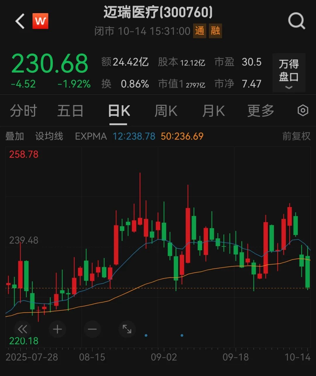 10月14日,迈瑞医疗股价收报230.68元/股,市值2797亿元。