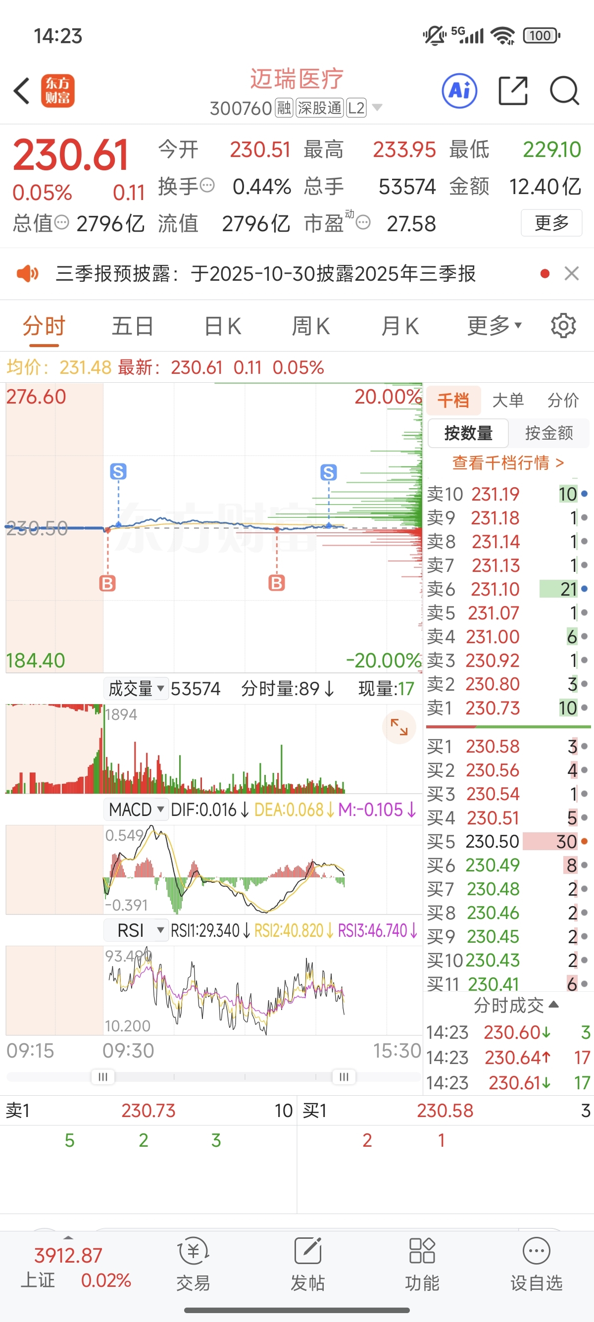 $迈瑞医疗(SZ300760)$ 230以下再来手,每次赚120块就行,手续费20,今天的夜宵有了