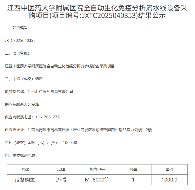 2024年5月,广西壮族自治区政府采购网发布了《广西建澜项目管理有限公司关于全自动生化免疫分析仪及全自动生化免疫流水线采购中标公告》。广西壮族自治区妇幼保健院采购的全自动生化免疫流水线,最终以1元的价格中标,该流水线来自迈瑞的产品(MT8000/BS-2800M/CL-8000i),供应商为华润(广东)医学检验有限公司。