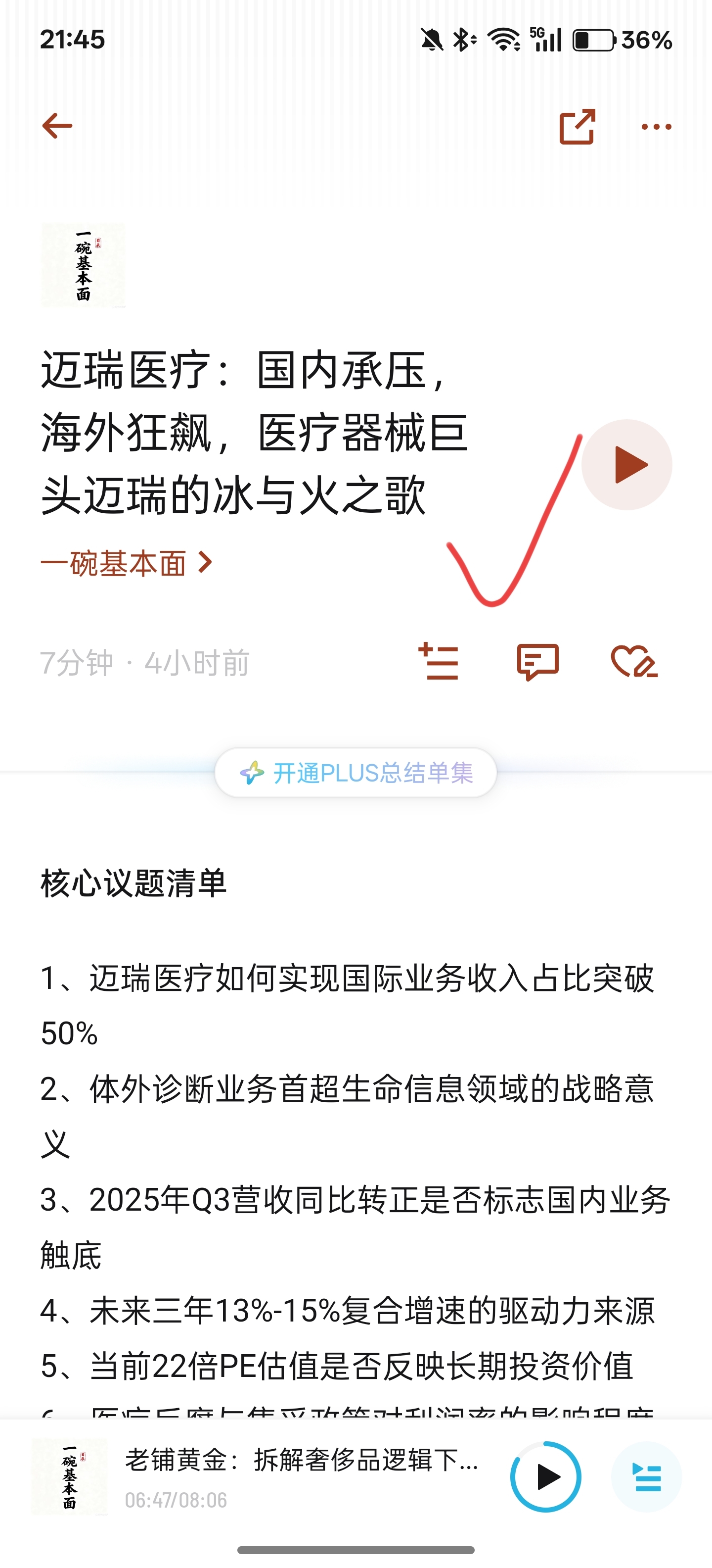 小宇宙app,主理人“一碗基本面”,10月30日发的一篇关于“迈瑞医疗”的播客挺
