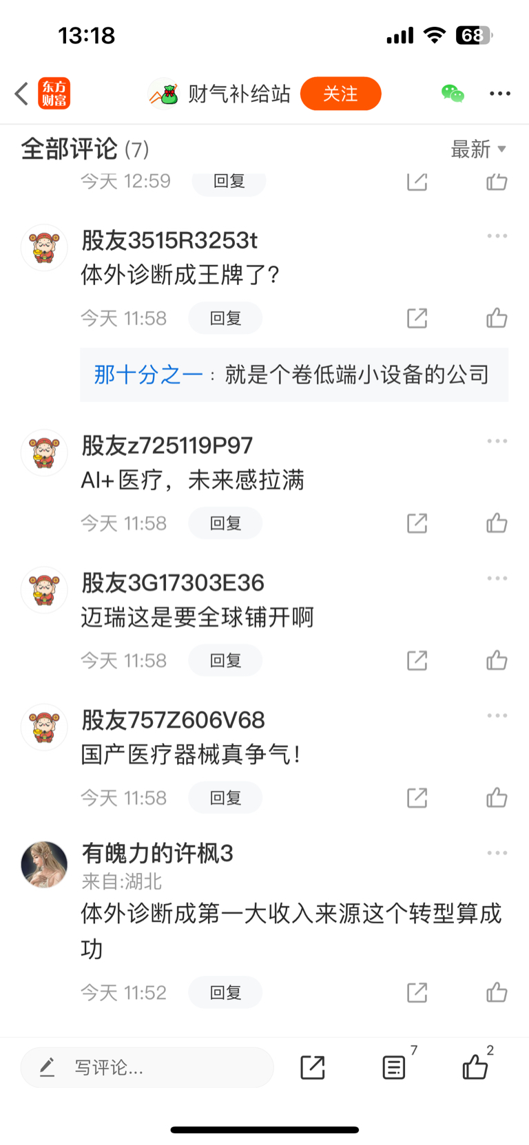 $迈瑞医疗(SZ300760)$ 这三个到底是机器人还是这个人的小号?专门只给自己评论