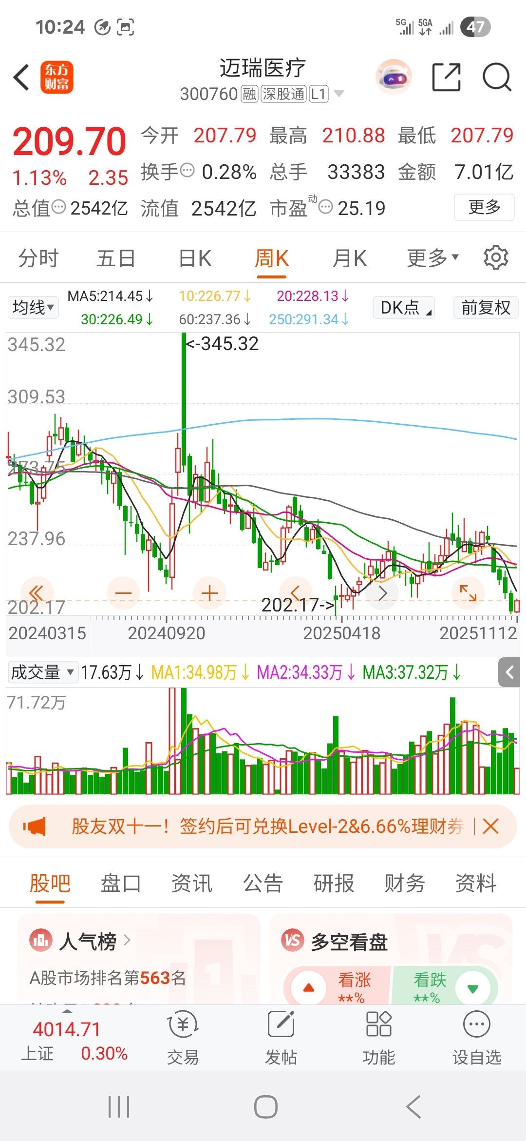 $迈瑞医疗(SZ300760)$ 周k大底,要买赶紧买