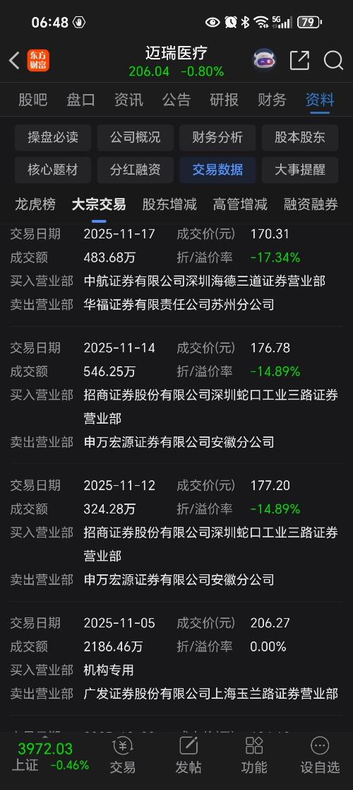 根据公开信息,截至近期(以最新披露数据为准),迈瑞医疗的大宗交易中,买家和卖家主要集中在机构投资者及部分券商营业部,具体特征如下: 一、卖家端:以机构减持为主,个别营业部有集中抛售 - 机构专用席位:是主要卖方力量,可能涉及部分公募基金、保险资管等机构的调仓行为。例如,近期多笔大宗交易的卖方为“机构专用”席位,单笔成交金额从数千万元到数亿元不等,反映出机构对医疗器械板块短期估值或行业节奏的分歧。- 券商营业部:少数卖方为知名营业部,如中金公司上海分公司、中信证券北京总部营业部等,可能涉及私募或大户的阶段性获利了结。 二、买家端:机构接盘为主,长线资金布局明显 - 机构专用席位:是核心买方,包括社保基金、QFII(合格境外机构投资者)及部分私募基金,体现出专业机构对迈瑞医疗长期竞争力的认可。例如,多笔大宗交易的买方为“机构专用”席位,且折价率普遍较低(多数在1%-3%),显示买方对价格的接受度较高,更倾向于中长期配置。- 券商资管及自营席位:部分券商的资管计划或自营账户也参与接盘,可能基于对医疗器械行业政策(如集采边际缓和)及迈瑞全球化布局(海外营收占比超40%)的乐观预期。 三、交易特征:折价率低,成交稳定 近期迈瑞医疗大宗交易的折价率普遍维持在1%-5%之间,低于A股大宗交易平均折价水平,说明买卖双方对当前股价认可度较高,抛压相对温和。成交金额多集中在1-5亿元区间,未出现单日巨额成交,显示交易以机构正常调仓为主,而非极端性抛售。 综上,迈瑞医疗近期大宗交易呈现“机构间换手”特征,卖方以部分机构减持为主,买方则以长线资金接盘为主,反映出市场对其长期价值的分歧较小,短期交易更多受资金调仓和板块节奏影响。具体每笔交易的详细买卖席位,可通过交易所官网或行情软件查询实时披露数据。