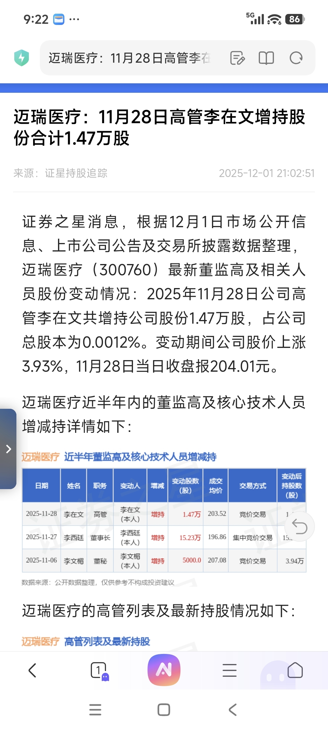 $迈瑞医疗(SZ300760)$ 公司高管继续增持