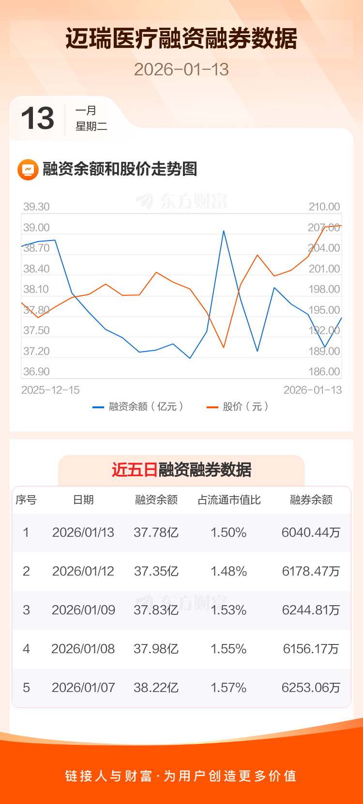 交易所最新数据显示,迈瑞医疗于2026年1月13日获融资买入3.99亿元,融资偿还3.56亿元,当日融资净买入4255.57万元。目前,该股融资余额37.78亿,占流通市值比例为1.50%。