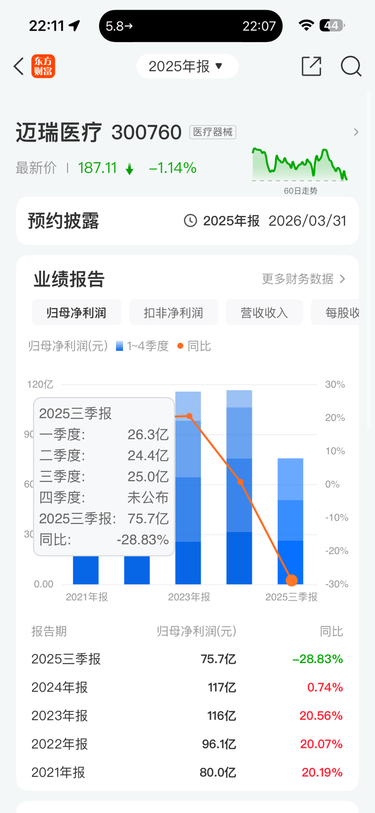 $迈瑞医疗(SZ300760)$ 季报业绩创新低,股价当然相同,估计还要阴跌到150元才能止跌!