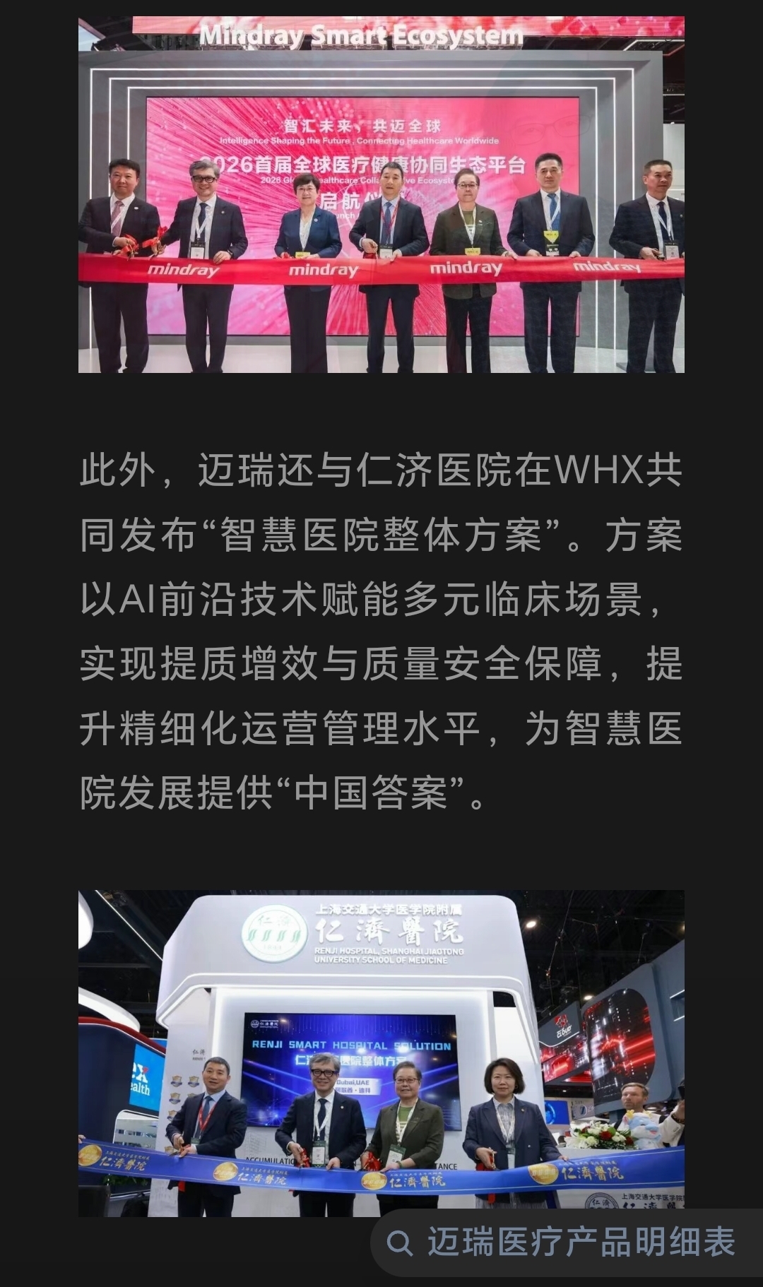 此外,迈瑞还与仁济医院在WHX共同发布“智慧医院整体方案”。方案以AI前沿技术赋能多元临床场景,实现提质增效与质量安全保障,提升精细化运营管理水平,为智慧医院发展提供“中国答案”。