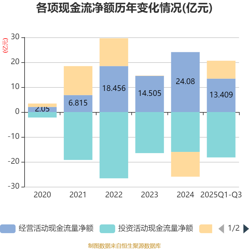 2025年前三季度,公司经营活动现金流净额为13.41亿元,同比下降25.75%;筹资活动现金流净额7.2亿元,同比增加10.87亿元;投资活动现金流净额-18.22亿元,上年同期为-15.46亿元。