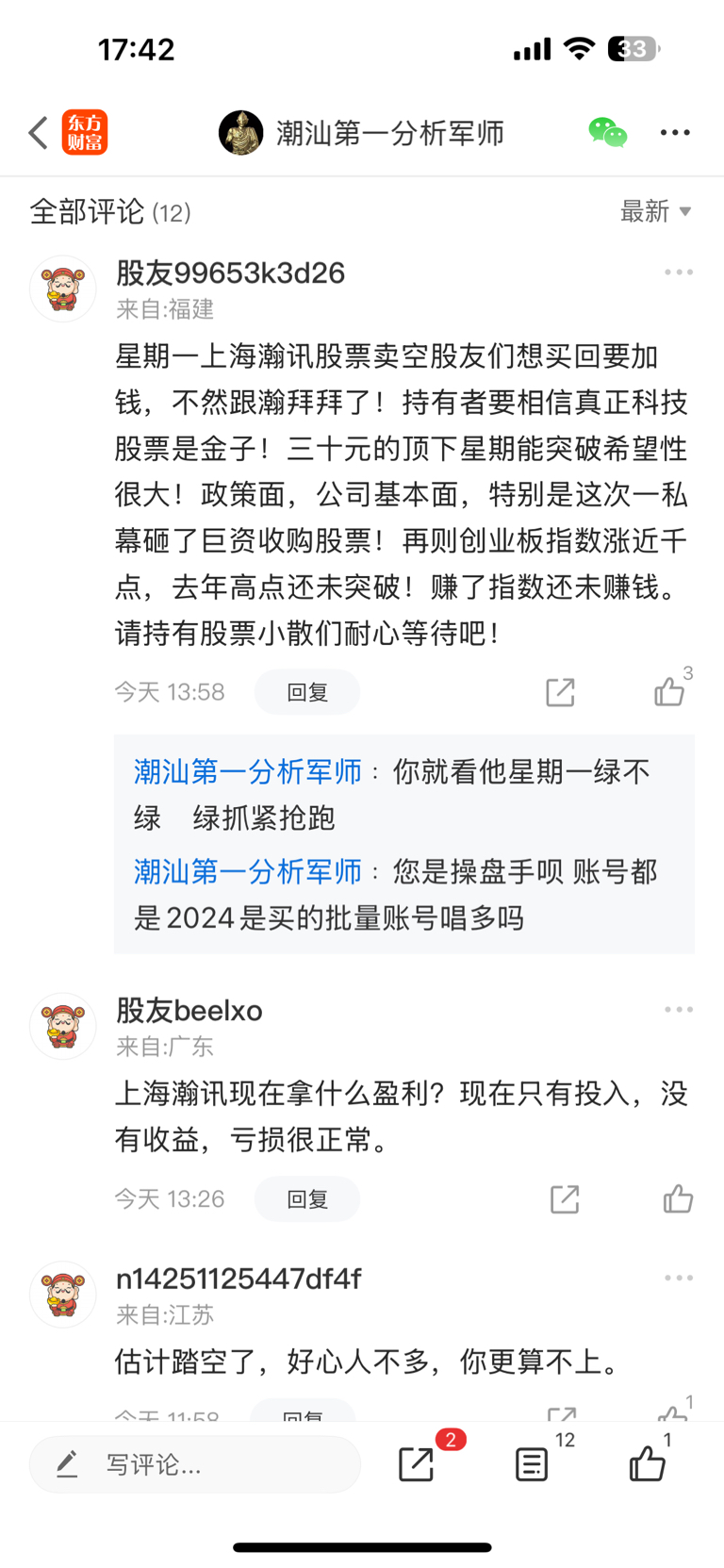 $上海瀚讯(SZ300762)$ 我是周五出货了,都是操盘手账号唱多,到顶了 各种评论 你们就看他星期一是不是绿色 绿色抓紧跑路#周末杂谈#