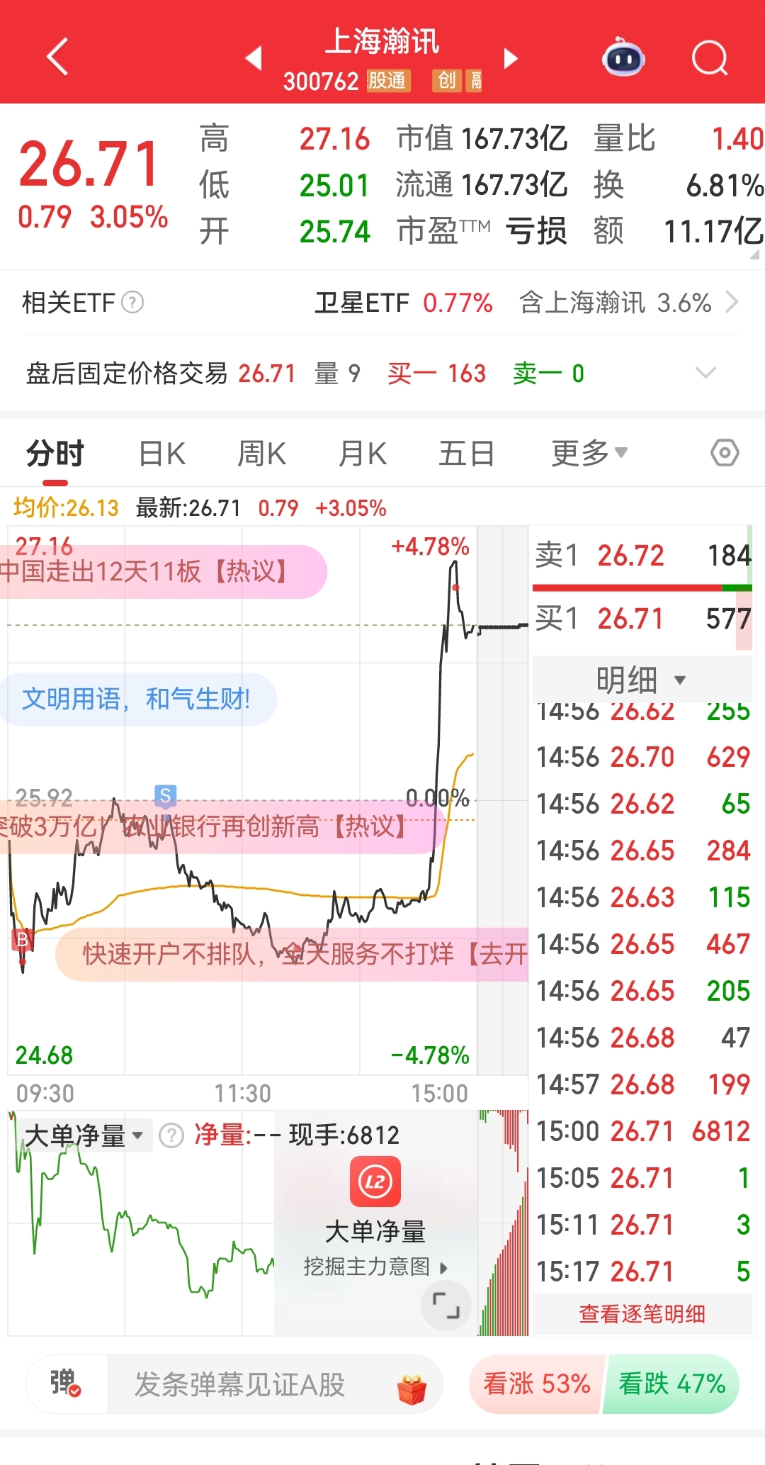 $上海瀚讯(SZ300762)$ 今天两次精准抄底