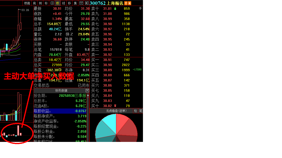 上海瀚讯截止收盘的主动大单净买入数据图,供各位大佬研究。