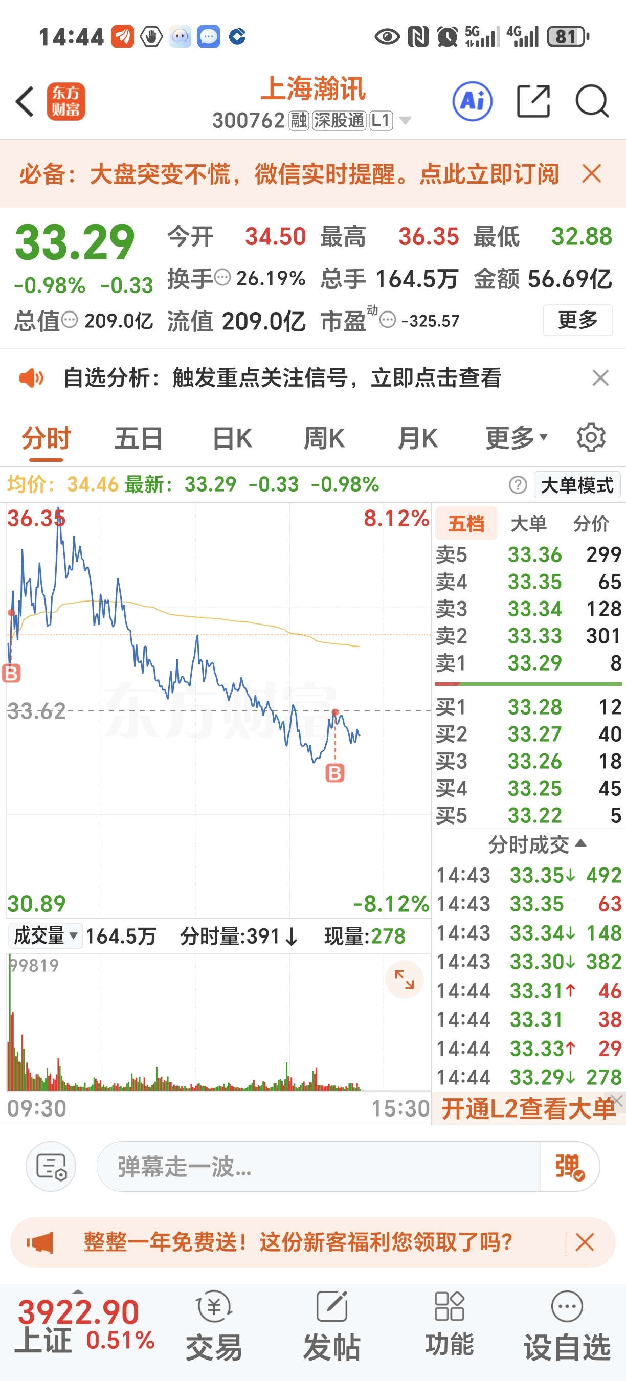 $上海瀚讯(SZ300762)$ 今天买!明天无论赔多少,开盘跑路!