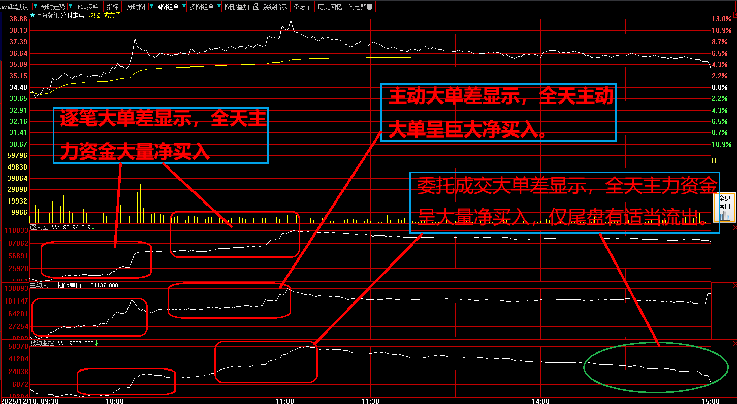 今天截止收盘的上海瀚讯高精度主动大单、逐笔大单、委托成交大单数据图,供各位大佬研究。