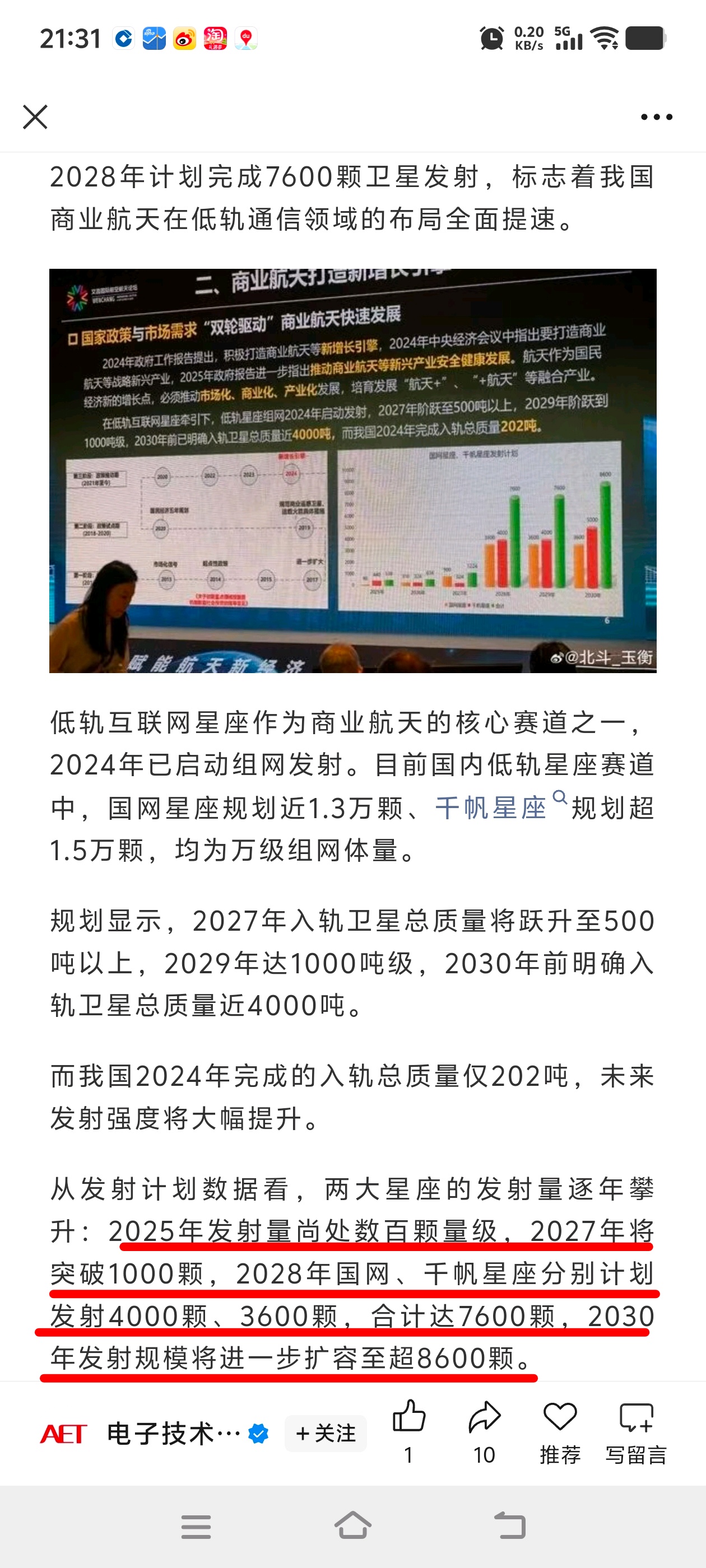 $上海瀚讯(SZ300762)$ $航天智装(SZ300455)$ $亚光科技(SZ300123)$ 12月23日消息,在文昌国际航空航天论坛上,我国低轨互联网星座的重磅规划公布,国网、千帆两大星座将开启密集发射节奏。