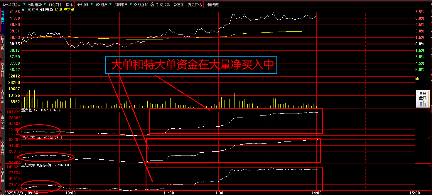 今天大单和特大单在大量净买入中,请看动态的主力数据图