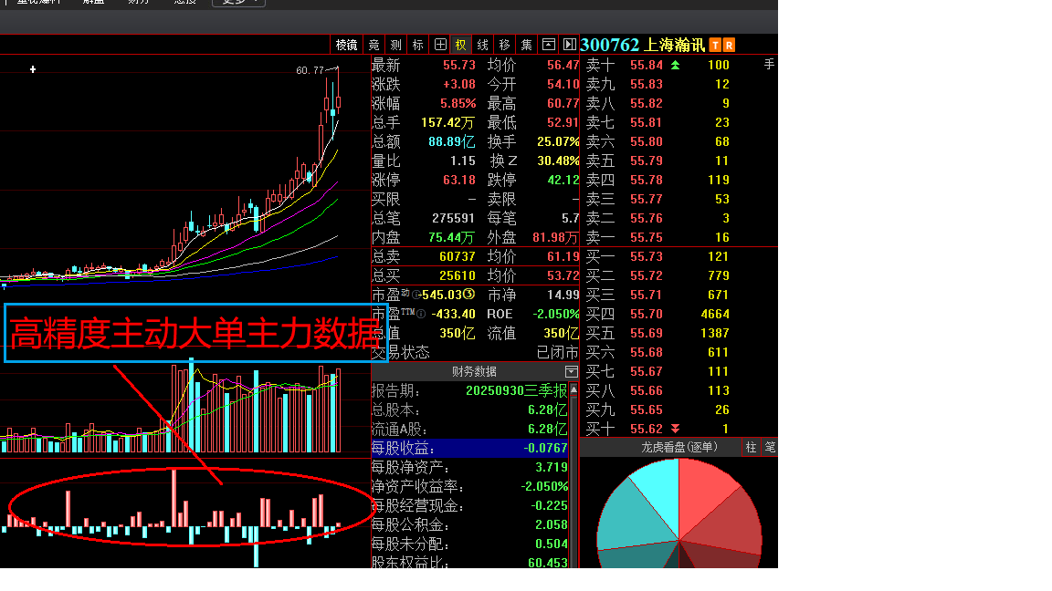 上海瀚讯最新高精度主力数据图(截止收盘),供各位大佬研究。红柱代表当天大单是净买