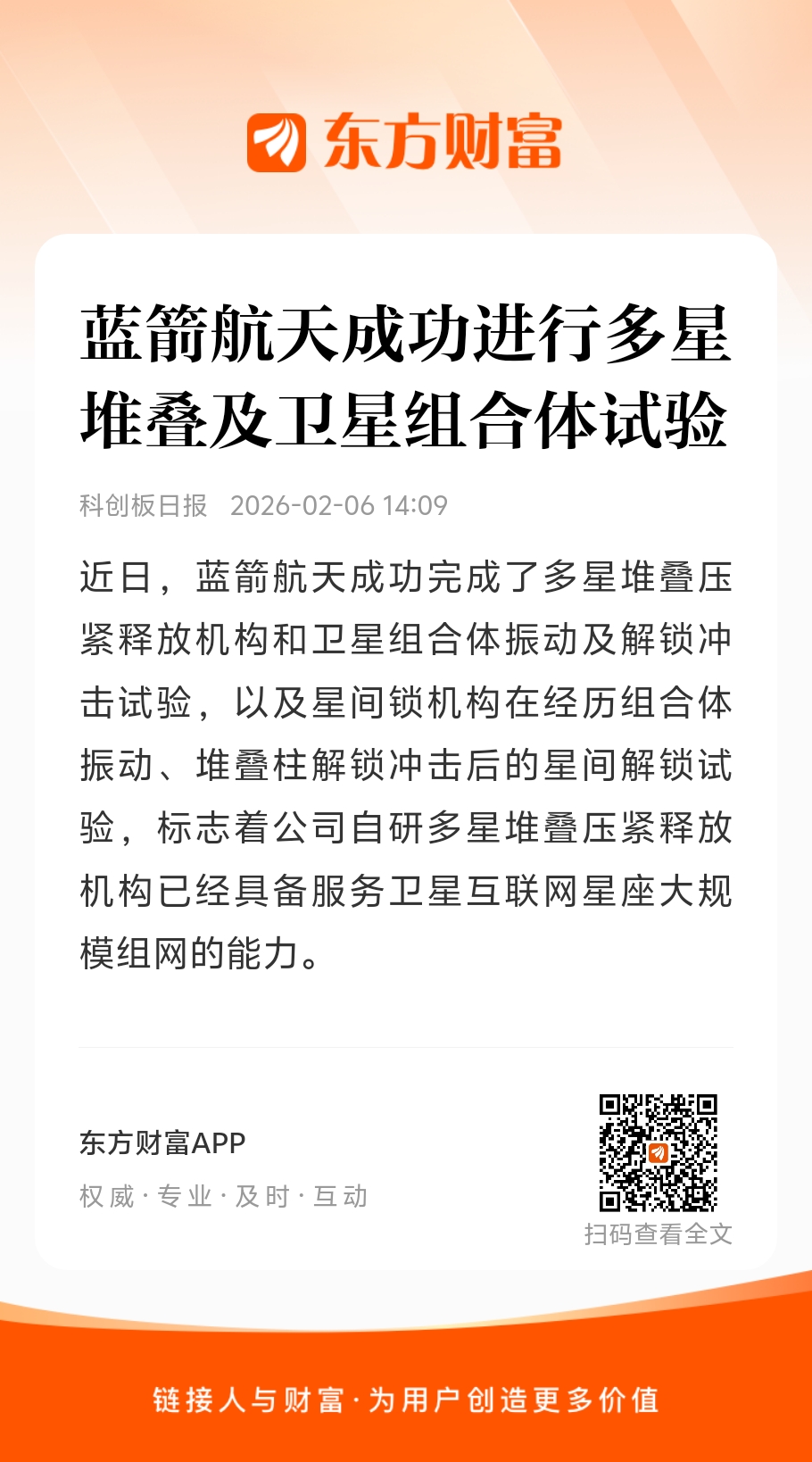 近日,蓝箭航天成功完成了多星堆叠压紧释放机构和卫星组合体振动及解锁冲击试验,以及星间锁机构在经历组合体振动、堆叠柱解锁冲击后的星间解锁试验,标志着公司自研多星堆叠压紧释放机构已经具备服务卫星互联网星座大规模组网的能力。