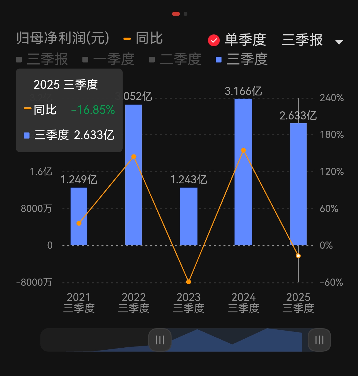 三季度净利润2.63亿,环比下降-35.38%,同比下降-16.85%,严重不及