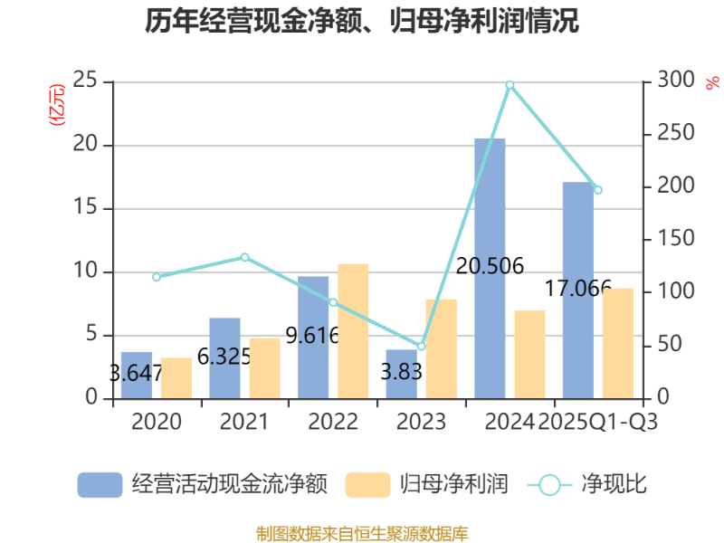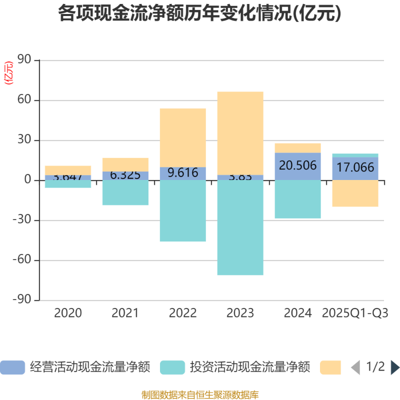 2025年前三季度,公司经营活动现金流净额为17.07亿元,同比增长21.22%;筹资活动现金流净额-20.01亿元,同比减少33.17亿元;投资活动现金流净额2.7亿元,上年同期为-26.6亿元。