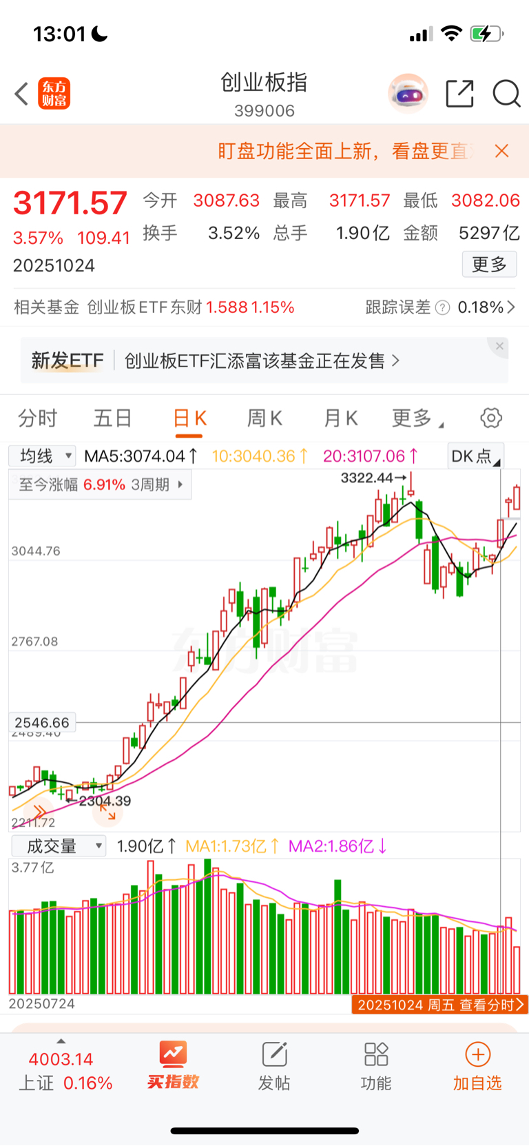 上夜班指数,三天涨了6%啊创业板。