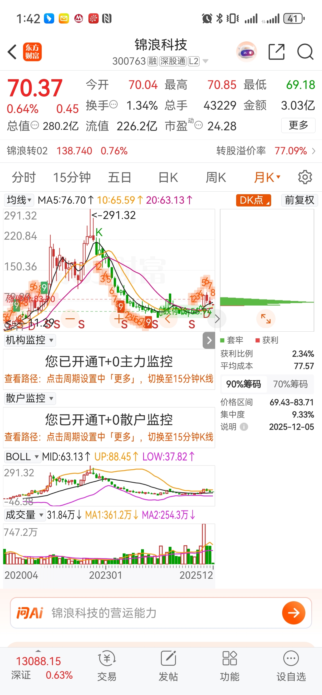 $锦浪科技(SZ300763)$ 前3个月月K放巨量,相比历史高点量能巨大,历史套牢基本换一轮了,然后是回调,目前跌不动了,吸筹,不会涨,如果能洗到63,就是黄金赶紧捡。