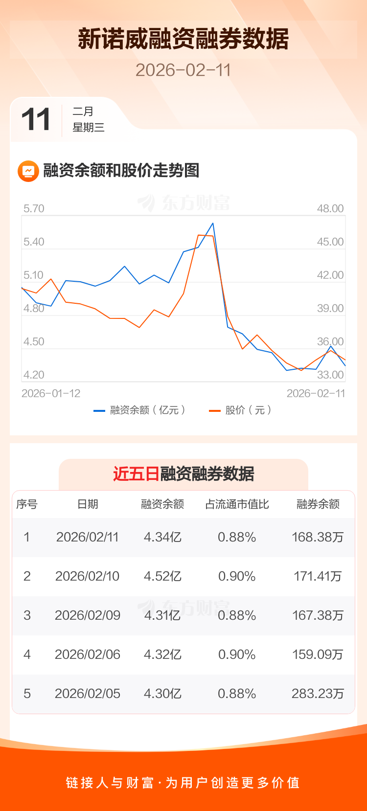 交易所最新数据显示,新诺威于2026年2月11日获融资买入2014.90万元,融资偿还3837.49万元,当日融资净偿还1822.59万元。目前,该股融资余额4.34亿,占流通市值比例为0.88%。