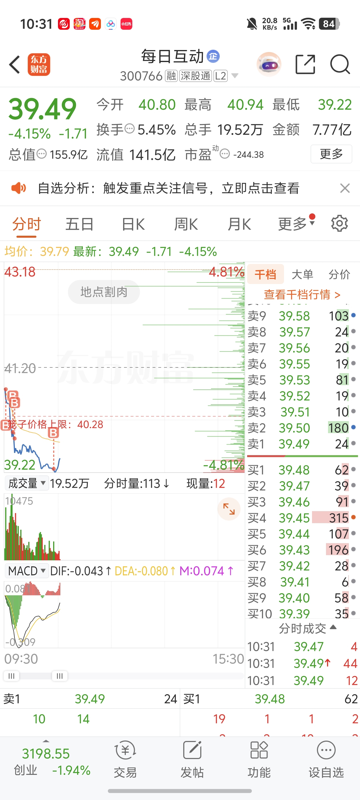 $每日互动(SZ300766)$ 还没买好 砸上去了