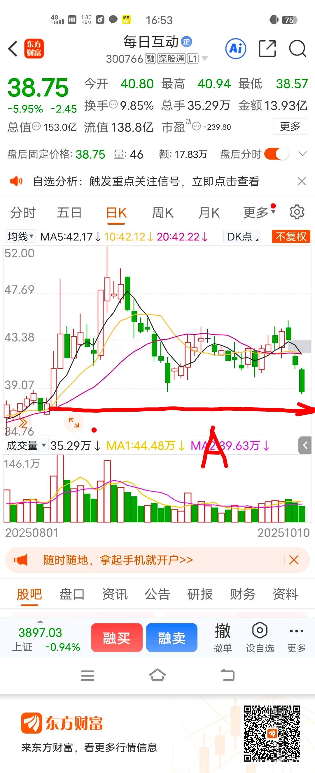 $每日互动(SZ300766)$ 看A线,37.96将是最后的洗盘位置?