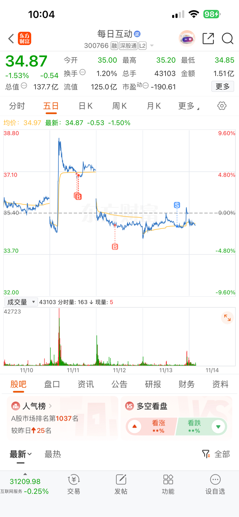 $每日互动(SZ300766)$ 你昨天尾盘不是很能吗?在你这里亏了多少次了,你以为就你一只票能玩哦,随便出去吃几个点,在你这里浪费多少时间,你真害人,本来今年都回本了,被你前天六个多点打的吐血,热色公司热色猪力