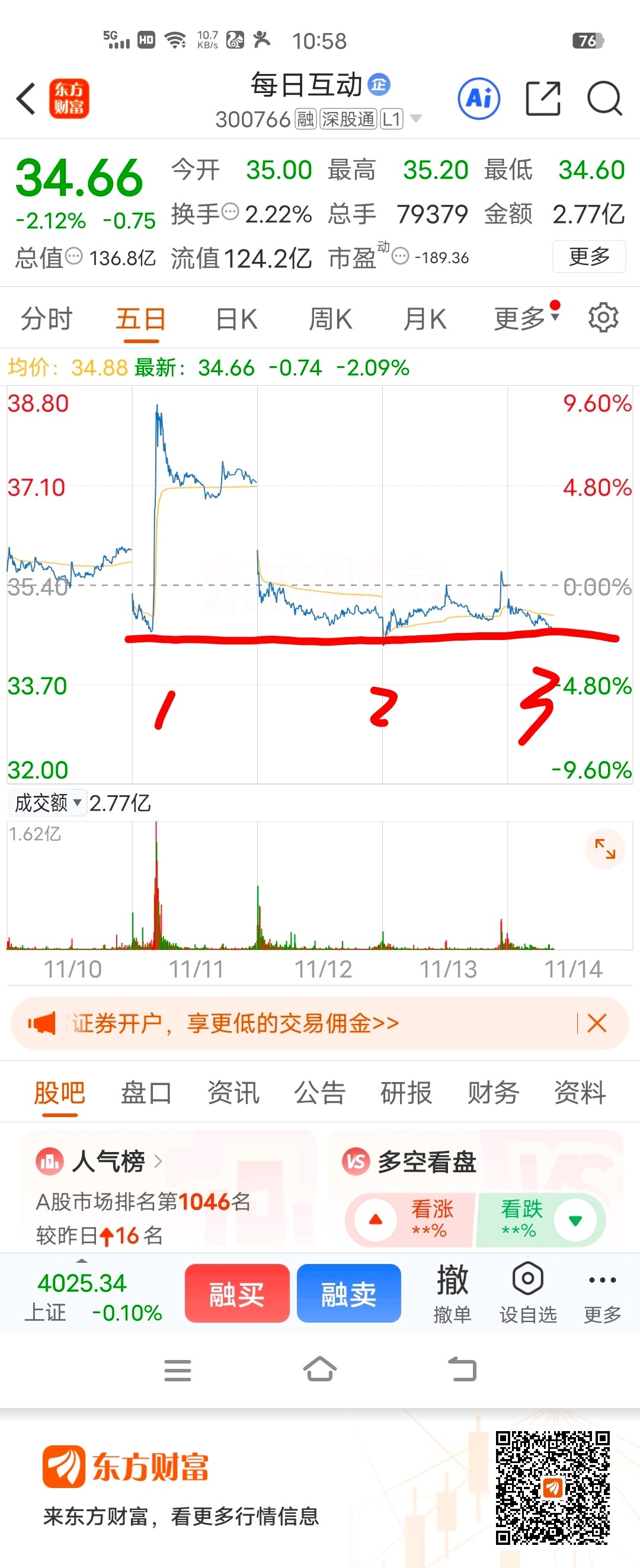 $每日互动(SZ300766)$ 看五日线图1、2、3,连续三个低点位出现,探底完成,周末将有好消息?