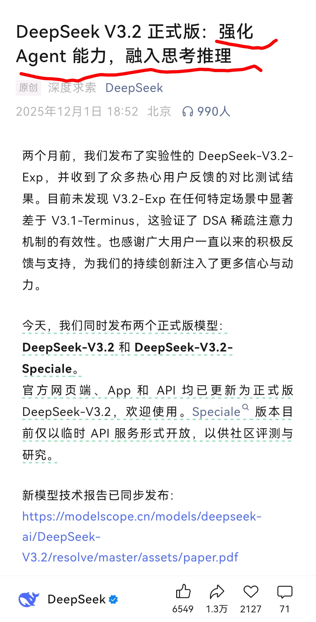 今天午盘涨是因为盘中的AI手机消息,DeepSeek升级消息是盘后出的,不知道双