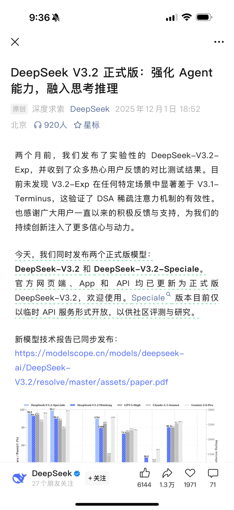 $每日互动(SZ300766)$ 课代表总结:在公开的推理类 Benchmark 测试中,DeepSeek-V3.2 达到了 GPT-5 的水平,仅略低于 Gemini-3.0-Pro;相比 Kimi-K2-Thinking,V3.2 的输出长度大幅降低,显著减少了计算开销与用户等待时间。