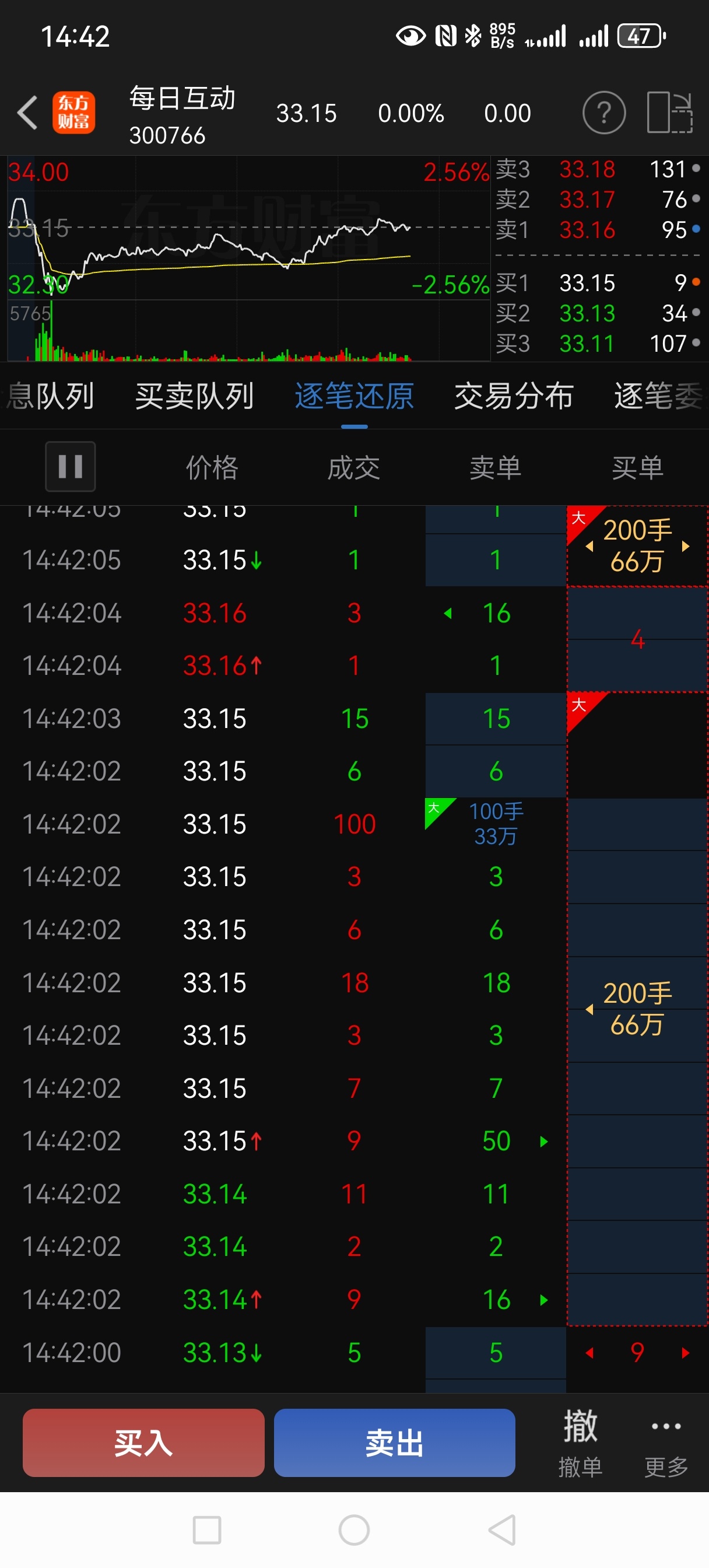 $每日互动(SZ300766)$ 还在有散户进,只要股价涨几分,就会时不时冒出一个大单砸下来,这控的也挺明显了。