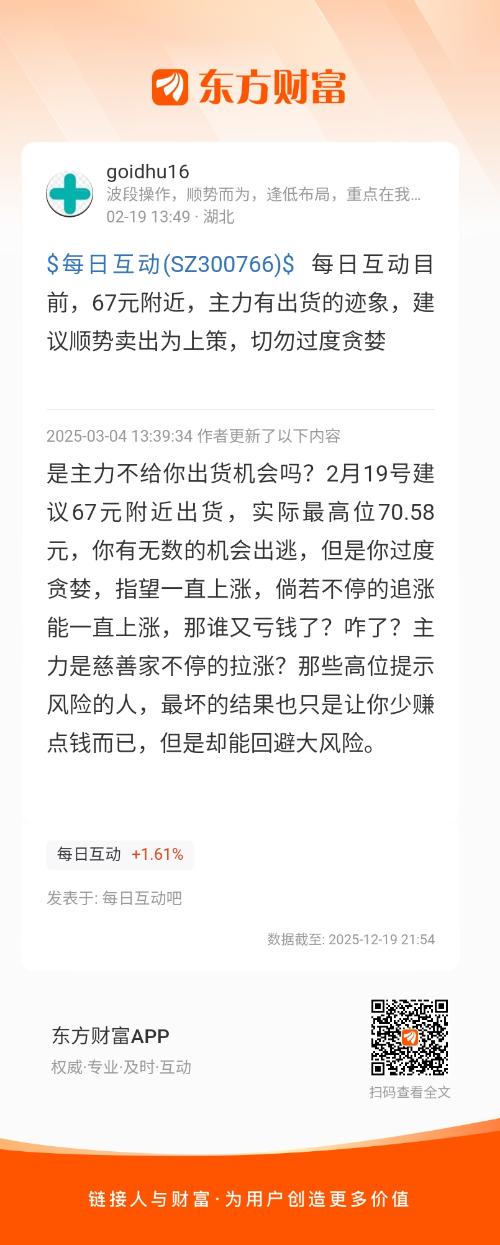 $每日互动(SZ300766)$  每日互动目前,67元附近,主力有出货的迹象,建议顺势卖出为上策,切勿过度贪婪