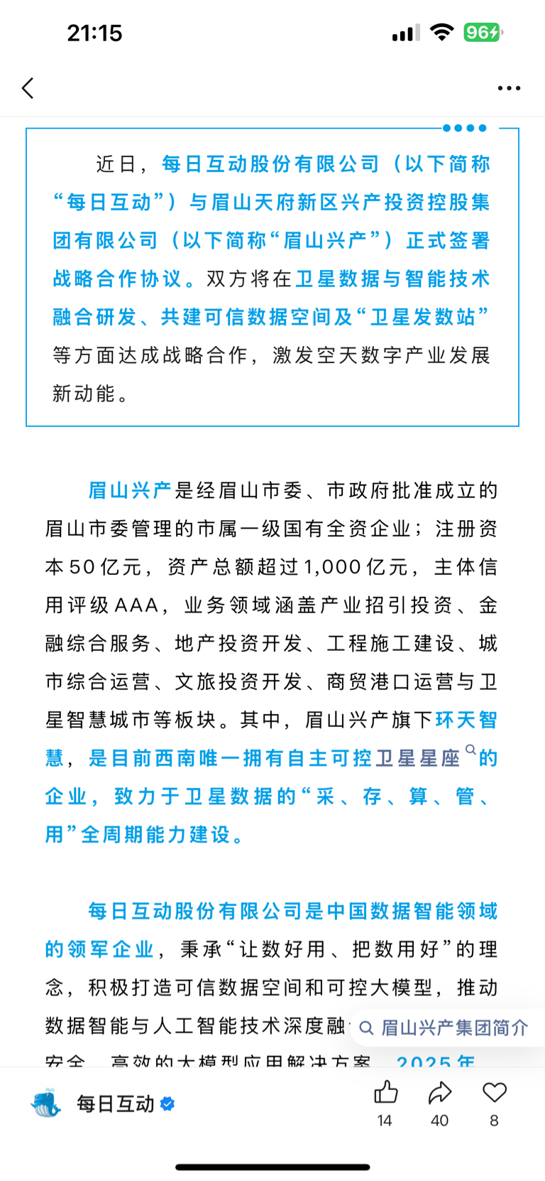 $每日互动(SZ300766)$ 川省公共资源交易信息网1月27日发布公告,“环天卫星星座建设项目”开展招标代理机构比选。招标人为环天智慧科技股份有限公司,项目估算金额12亿元。本项目建设内容为研制发射22颗遥感微小卫星,建设1套12米S/X遥感卫星地面接收天线及配套设备设施。其中10颗卫星及地面接收天线及配套设施已完成招标采购,此次选取的招标代理机构服务后续遥感微小卫星采购。四川省公共资源