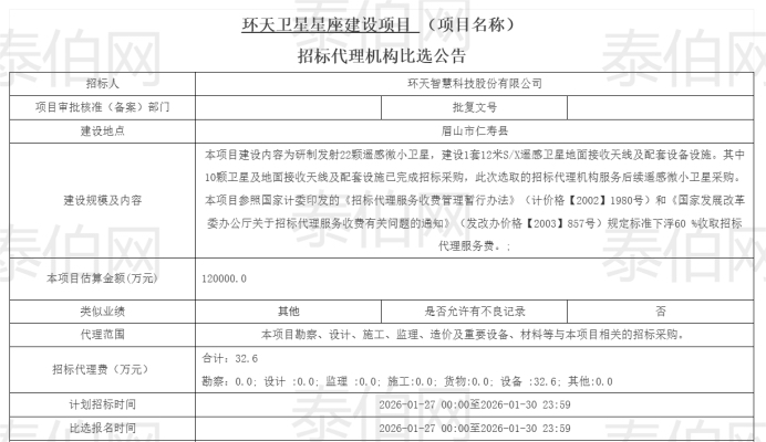 川省公共资源交易信息网1月27日发布公告,“环天卫星星座建设项目”开展招标代理机